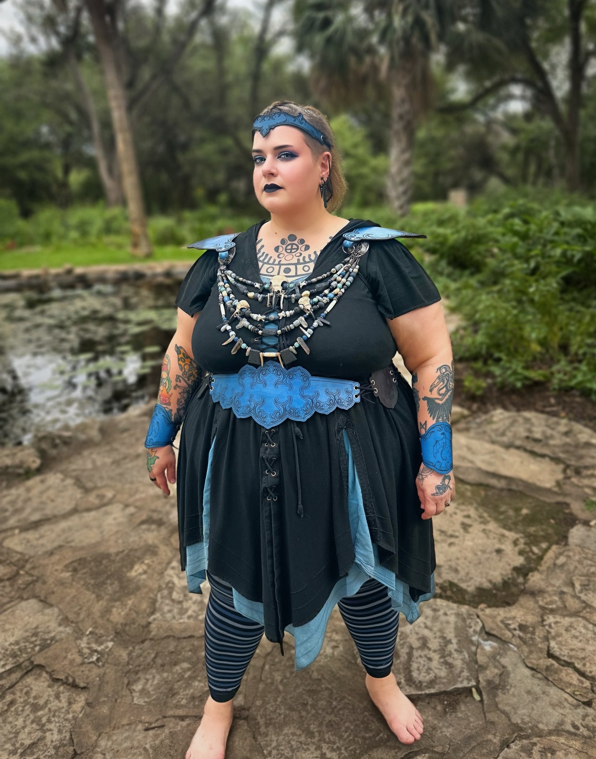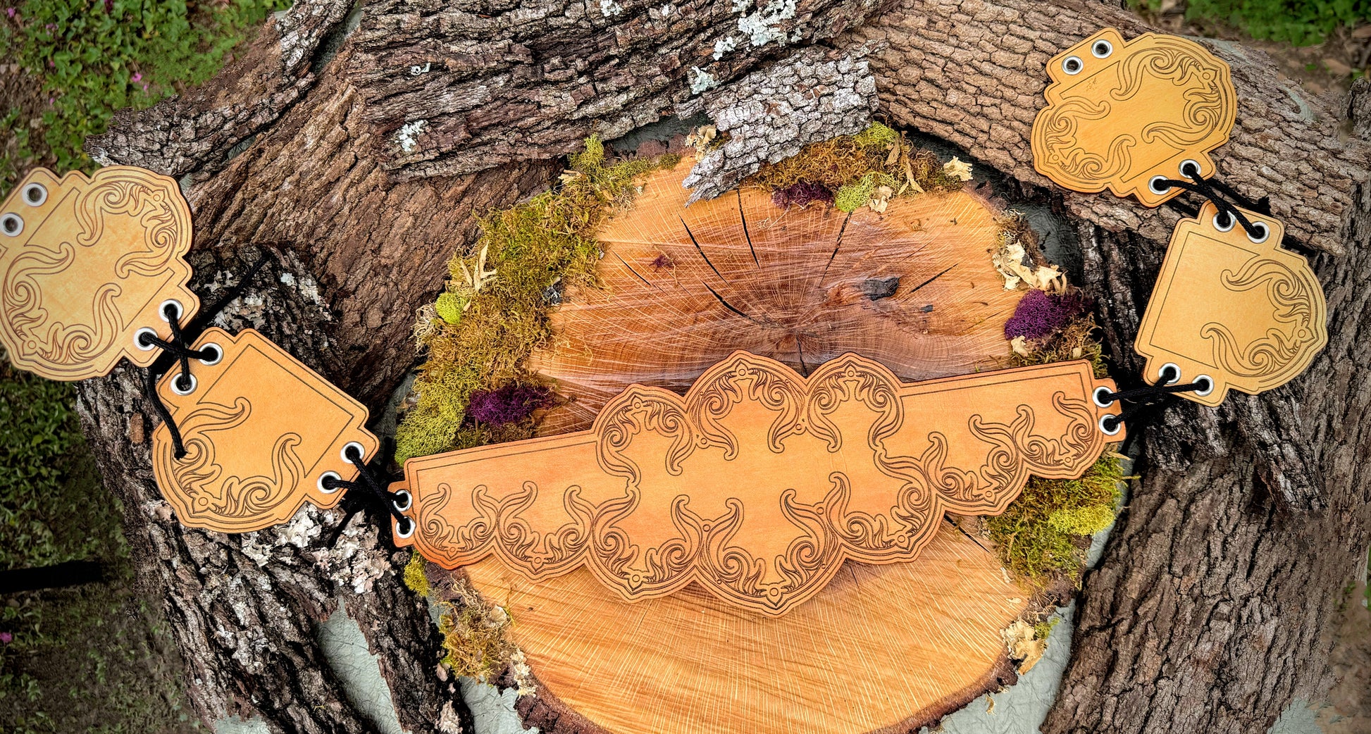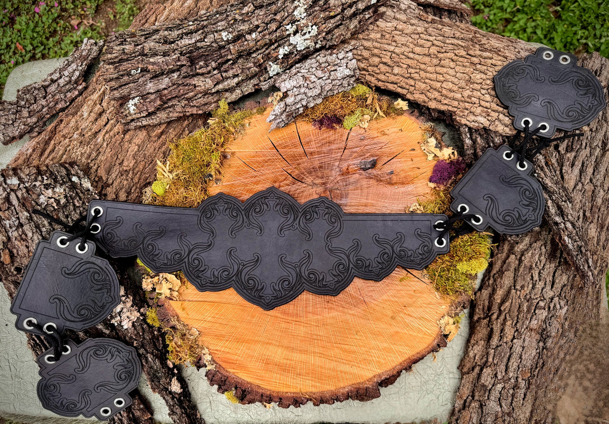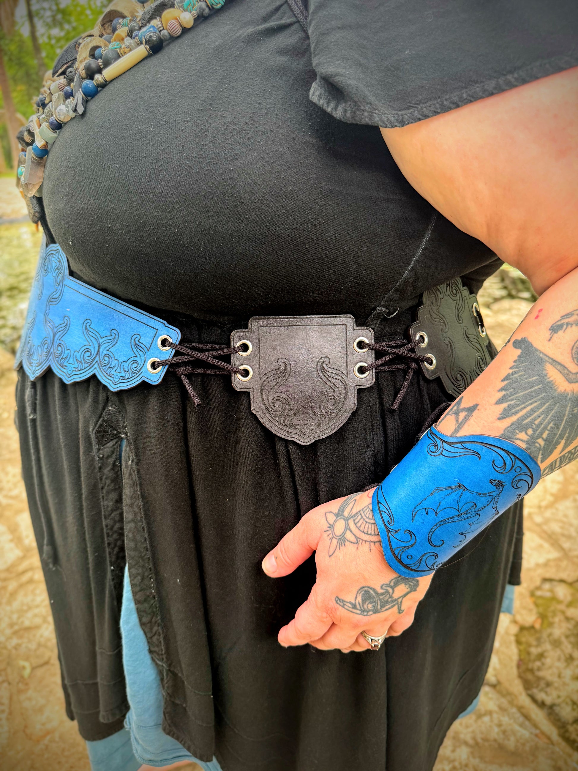 Digitally illustrated by yours truly and then laser engraved, the leather is embellished with a unique expression of femininity with uniformity and grace, and is then washed, dyed on both sides, and sealed. Comes with two eyeletted ends (for lacing two panels together), with cotton cords to lace into other panel pieces.