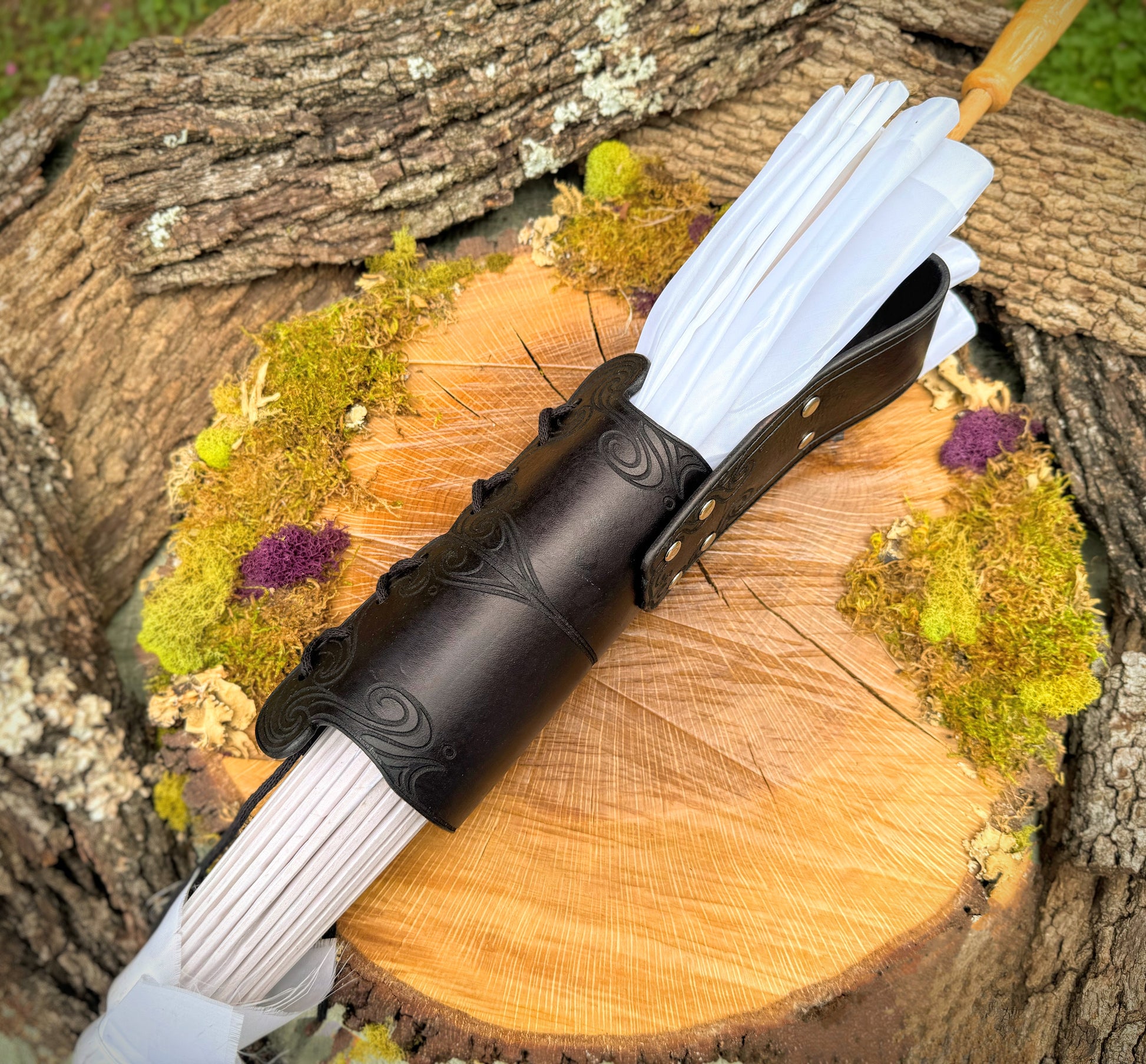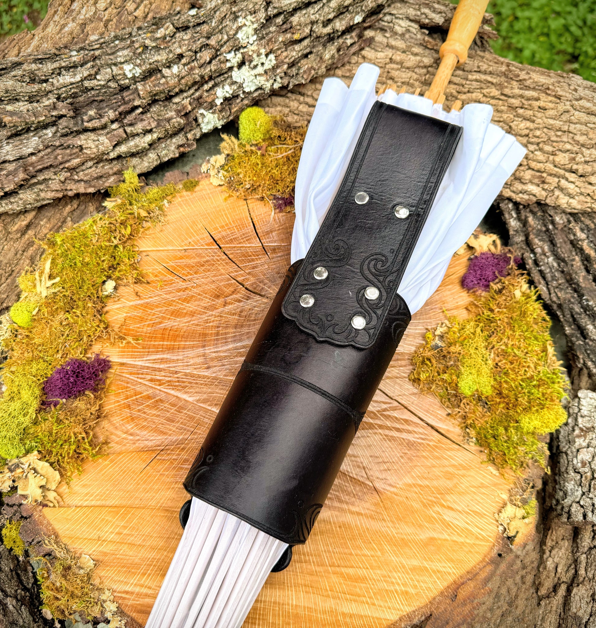 Digitally illustrated by yours truly and then laser engraved, the leather is embellished with a unique expression of femininity with uniformity and grace, and is then washed, dyed on both sides, and sealed. Riveted (not snapped) into place, and then laced with a cotton cord, your product is ensured comfort and durability while being free of synthetic materials.