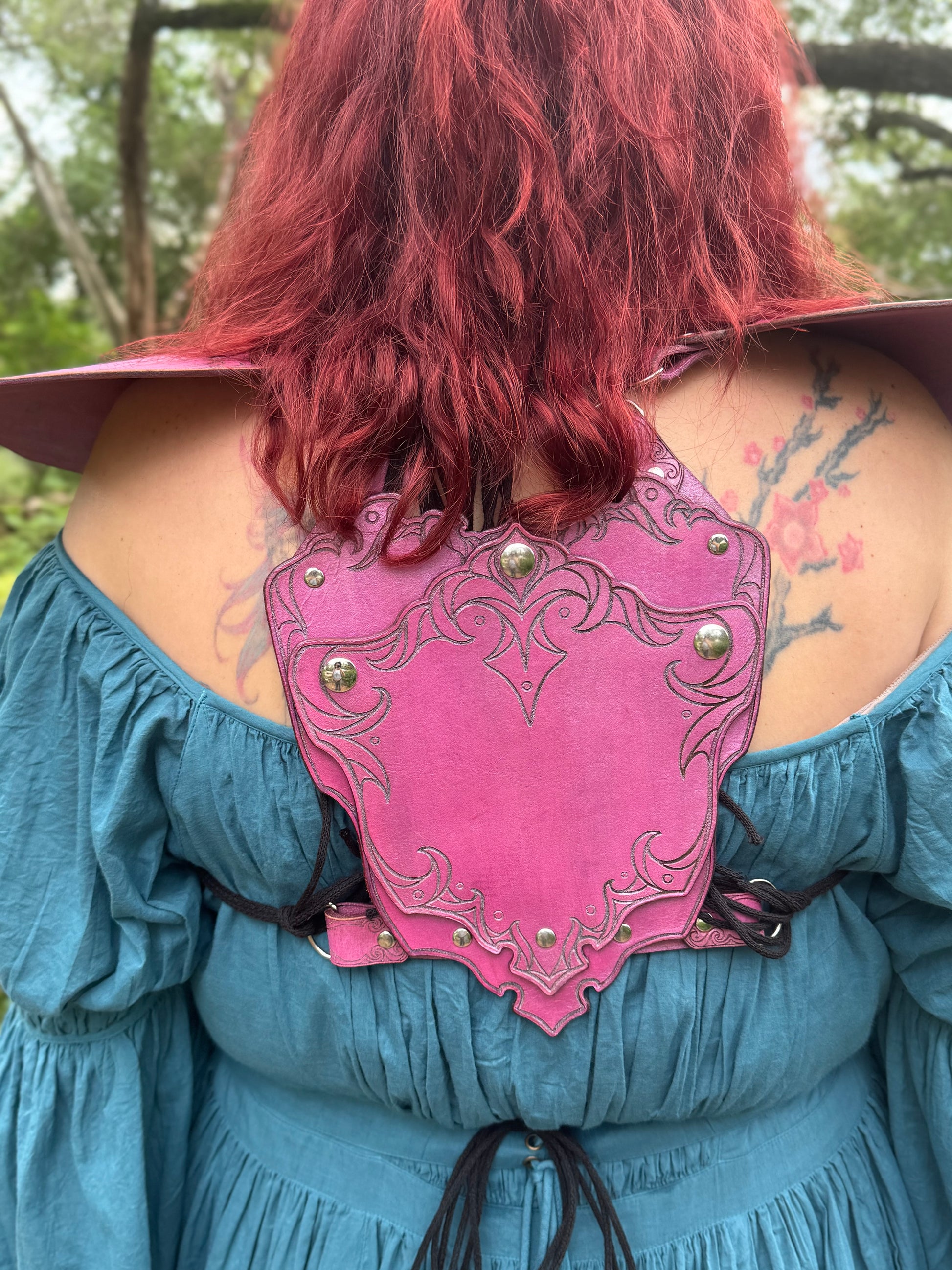 That being said, this pack attaches *currently* with tie on cords at four points (top left, top right, bottom left, bottom right). In the photos with our lovely model, Danielle, the pack was actually tied to the epaulettes and then the cincher- but there is no limit to ways you can make this comfortable for your needs and costume.